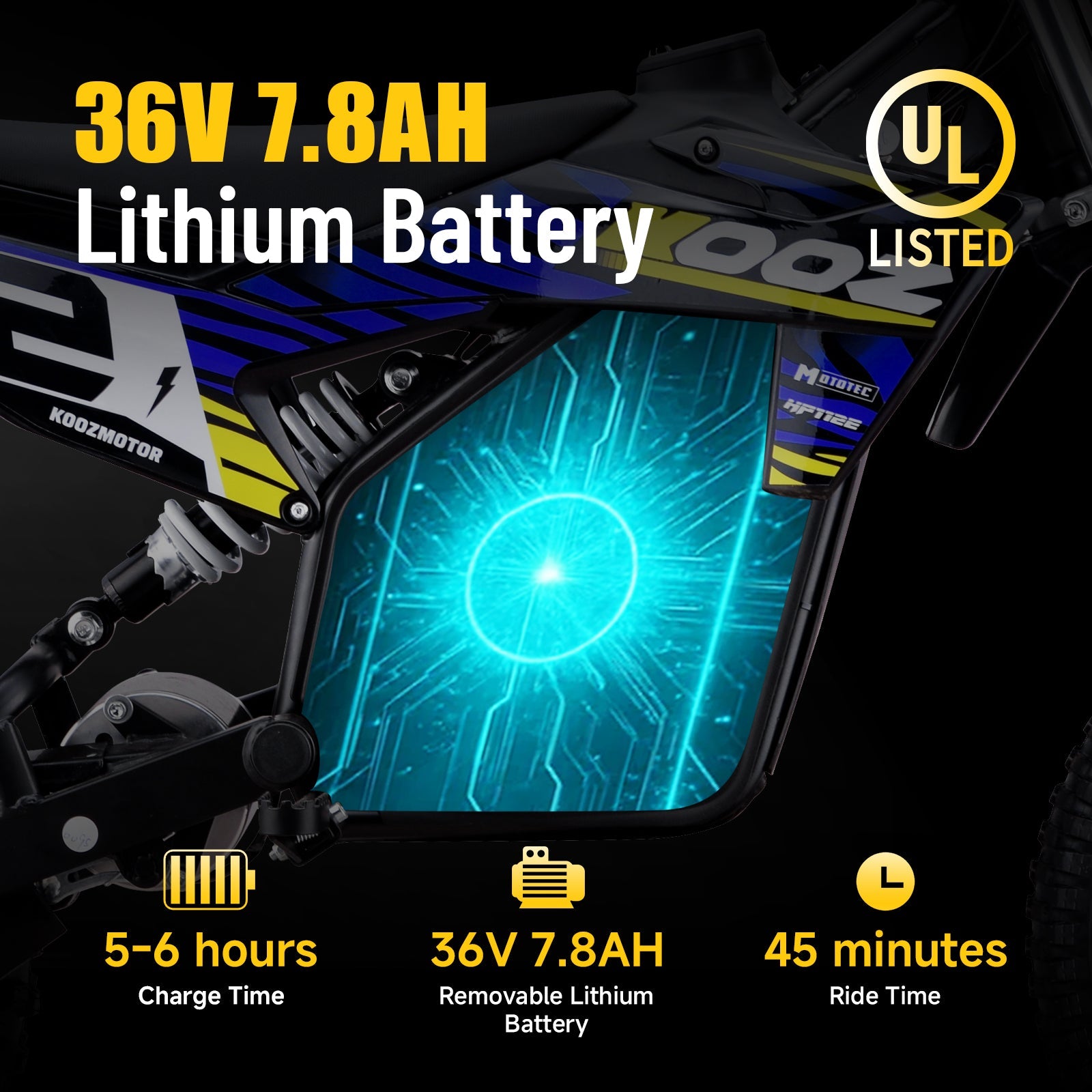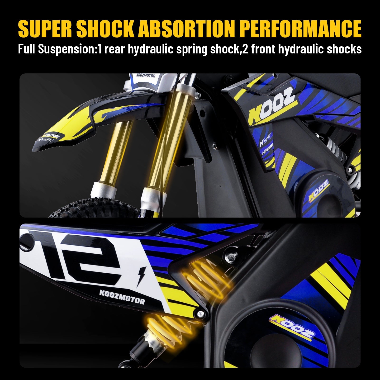 Introducing the HP112E 36v 1000w Electric Dirt Bike! Powered by a 1000 watt DC brushed electric motor, rugged chain drive, front and rear suspension and half twist throttle for safety. Great for driveway and backyard fun, cruise over bumps and speed through dirt trails with ease.Motor 36v 1000wBattery 36v7.8ah Lithium BatteryTop Speed18 mphCharge Time 5-6 hours (when fully drained)Suspension 2 front hydraulic shocks, 1 rear hydraulic spring shockRide Time 45 minutesThrottle Half TwistRecommended Age 7-14 YearsFrame SteelTransmission Chain DriveFront Wheel 2.4x16Rear Wheel 2.50-10Brakes Front & Rear DiskMax Rider Weight 150 lbsSeat Height 24.5 inchesWheelbase 37 inchesMin Ground Clearance 10 inchesBox Weight 51 lbsBox Size 42x22x15 inchesDirt Bike Weight 51 lbsDirt Bike Size 52x25x34 inchesDiscover the 36V 1000W electric dirt bike for kidssafe, fun off-road riding with rugged design and trusted quality.Discover the 36V 1000W electric dirt bike for kidssafe, fun off-road riding with rugged design and trusted Kooz quality.