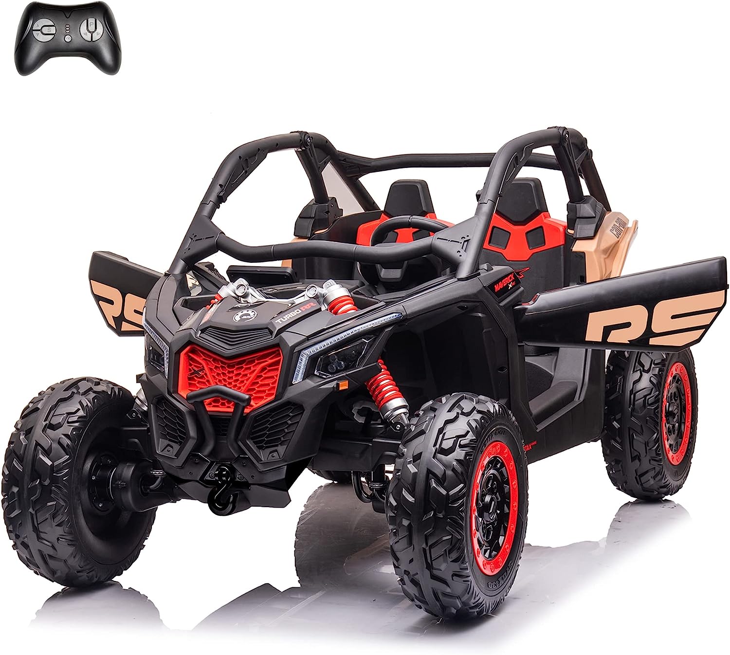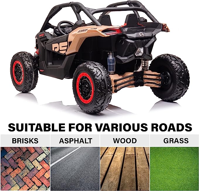 The Can-Am Maverick UTV Ride On from OurFunToys is an officially licensed product that promises quality and design.  The ride on car is built for rough terrain, with large EVA wheels for traction, coil sprung rear suspension, and 4x200W motors, making it the most powerful ride on buggy in its class.